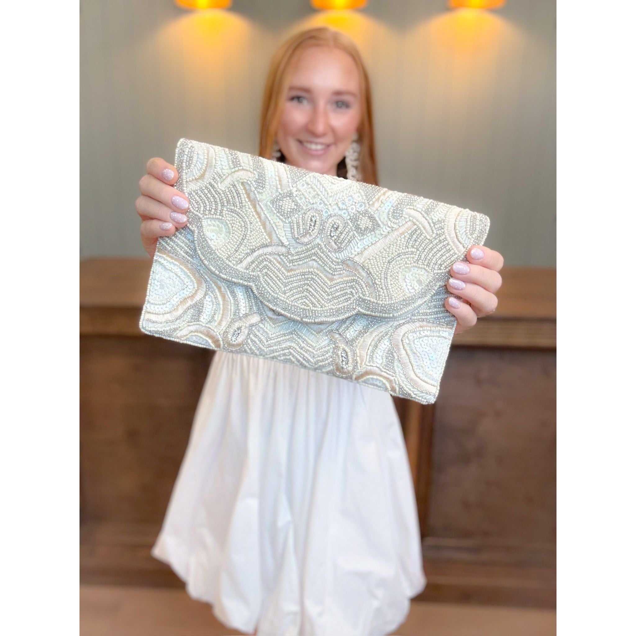 Elevate any outfit with the dazzling detail of our Seaside Shimmer Beaded Clutch. Hand-beaded with intricate patterns of pearls, sequins, and metallic accents, this fold-over clutch adds instant elegance to your look. The soft coastal hues make it versatile enough for weddings, vacations, or a chic night out. Carry it as a statement piece in hand or slip on the hidden chain strap for hands-free wear—either way, it’s your go-to sparkle for every special occasion. Size: 10.3 x 1 x 6 in