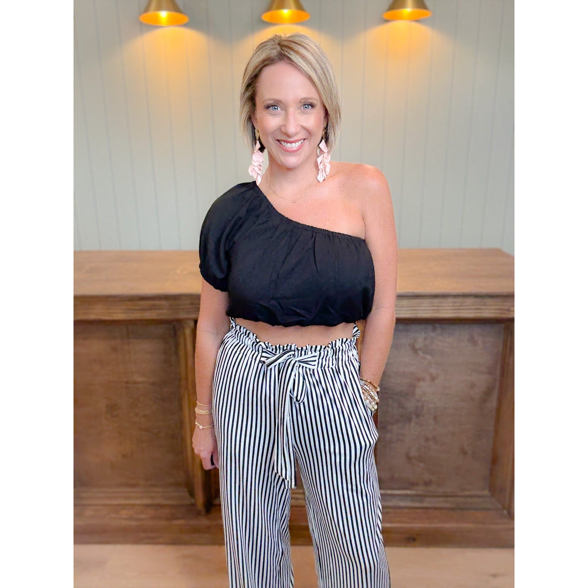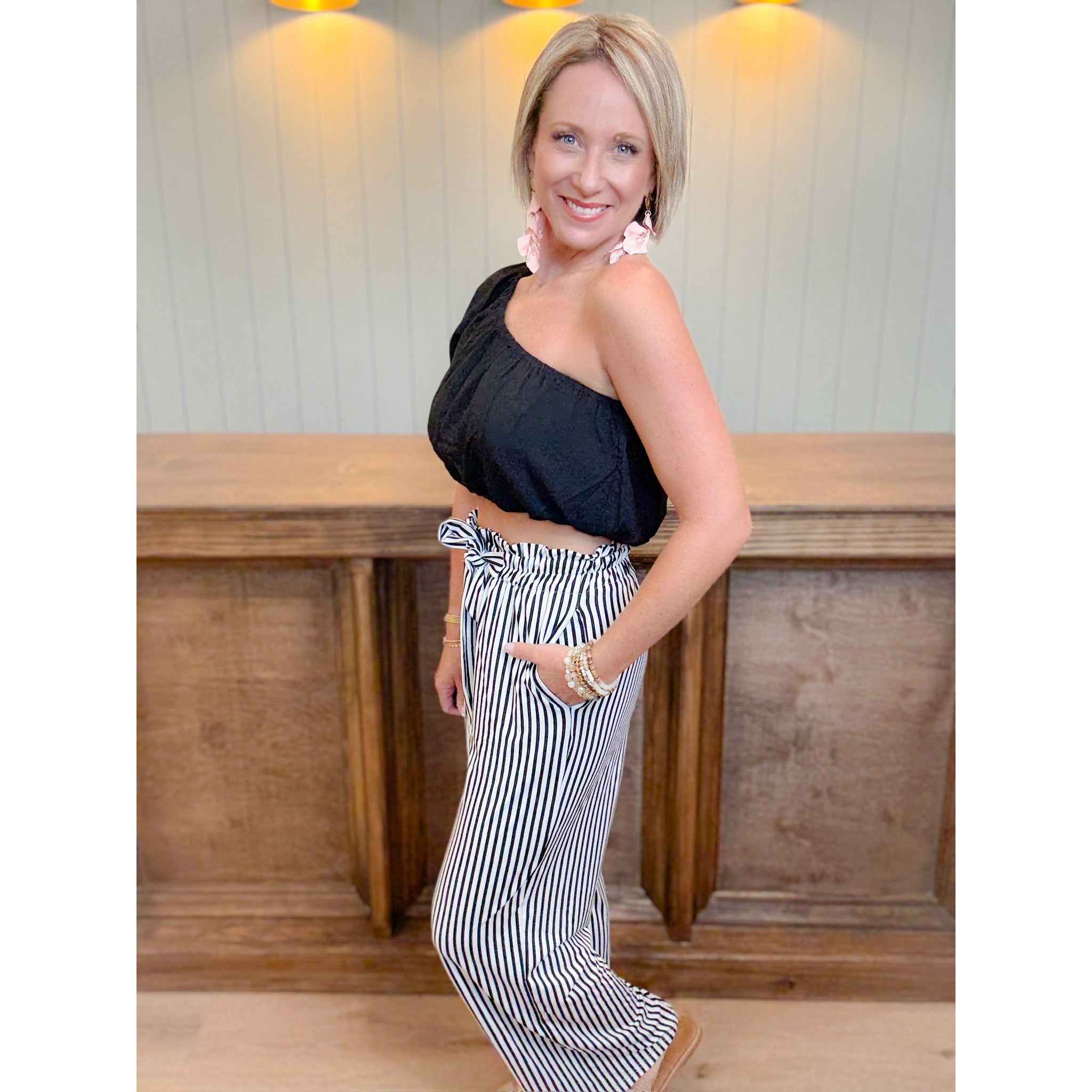 Effortless, breezy, and endlessly versatile — the Emerson Pocket Pants are your go-to for warm-weather style. Featuring a lightweight, breathable fabric with classic vertical stripes, these wide-leg pants deliver an easy fit with a flattering paperbag waist and self-tie belt. Side pockets add function without sacrificing style, while the cropped length pairs perfectly with sandals or sneakers. Dress them up for brunch or keep them casual for a beach stroll — these pants do it all.