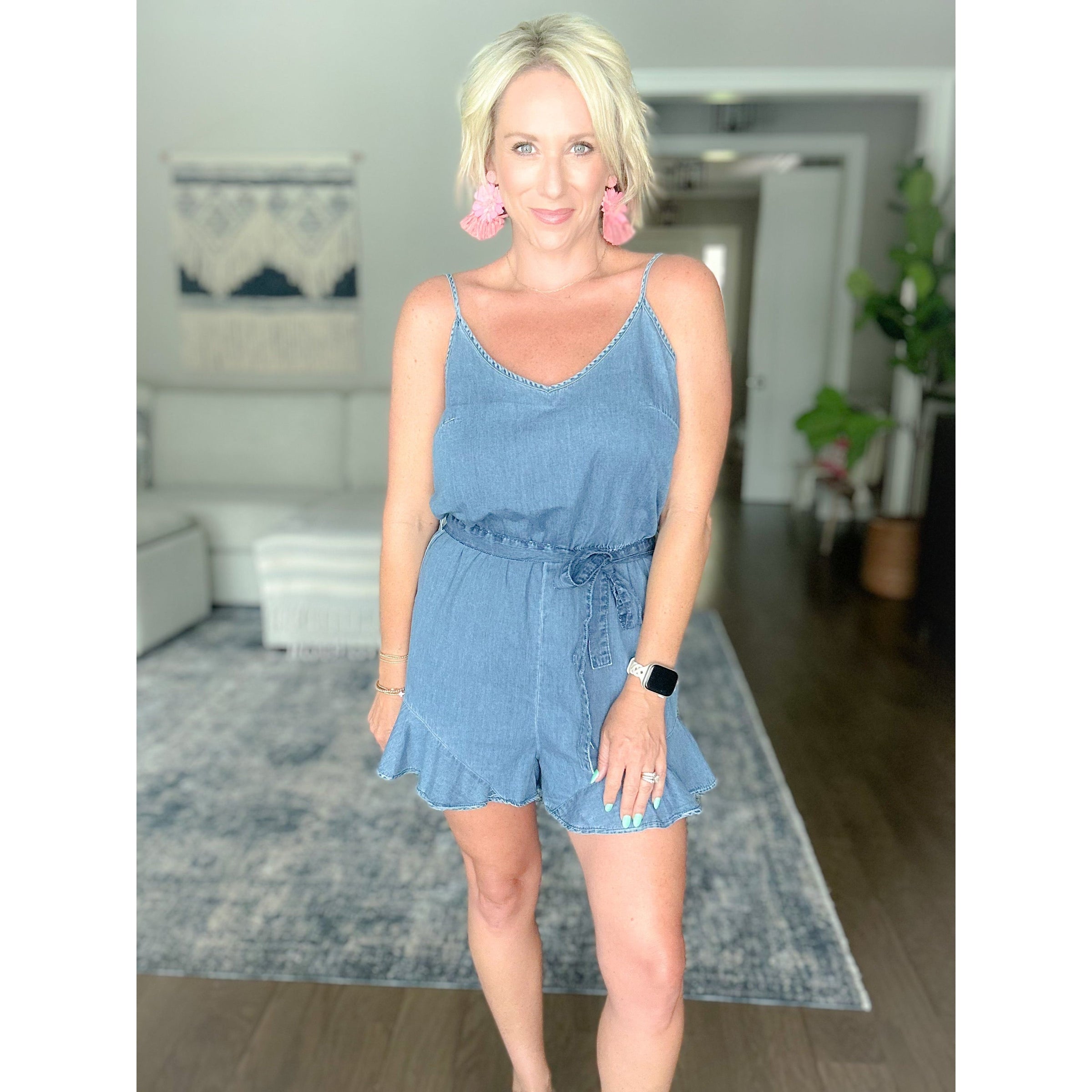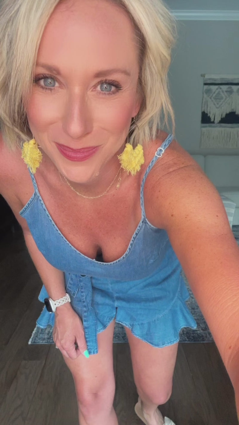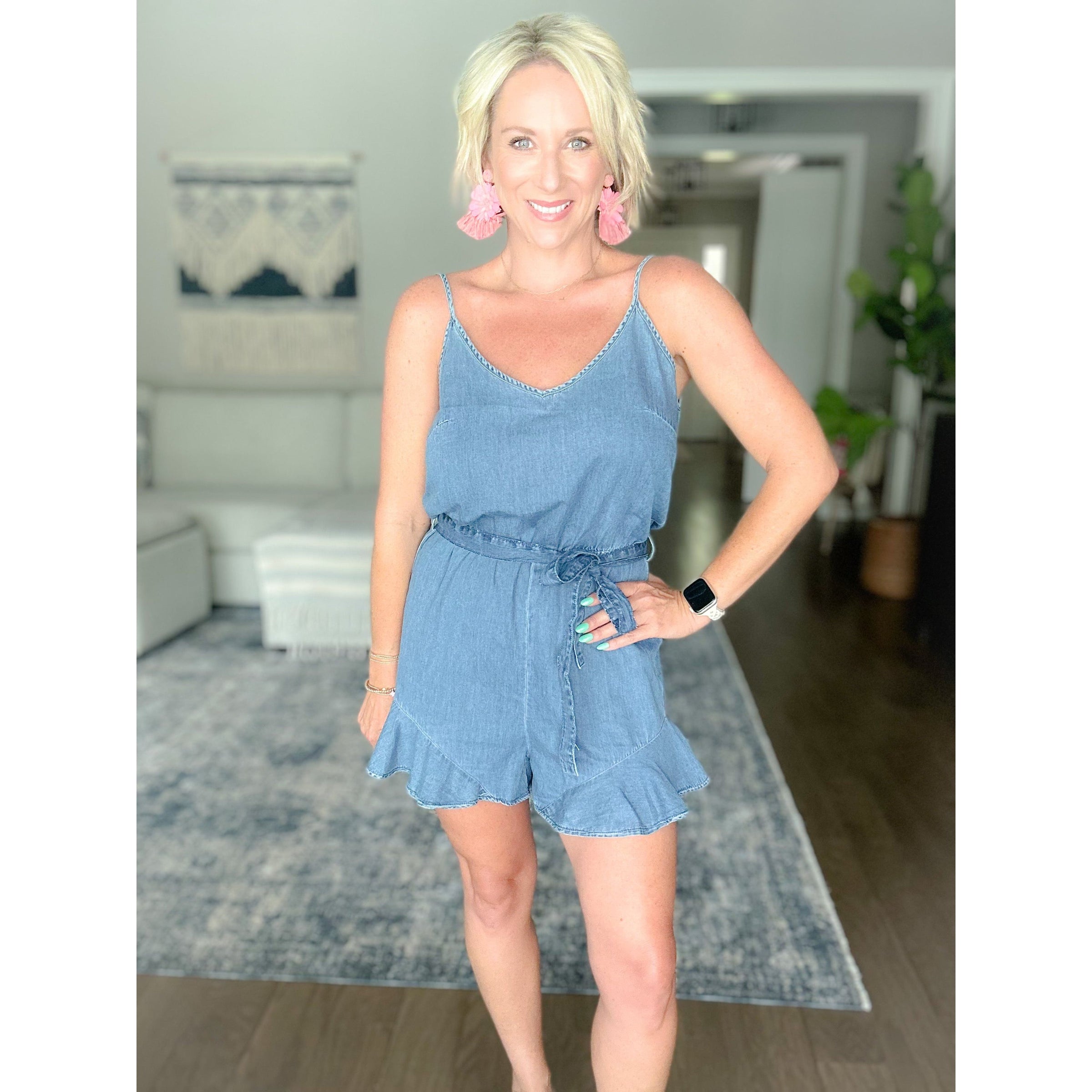 Run, skip, dance, and lounge your way through summer in our Caroline Belted Chambray Romper. Made with a light weight material, this romper offers both comfort and style. Perfect for any occasion, our romper is sure to add some fun and playfulness to your wardrobe.
