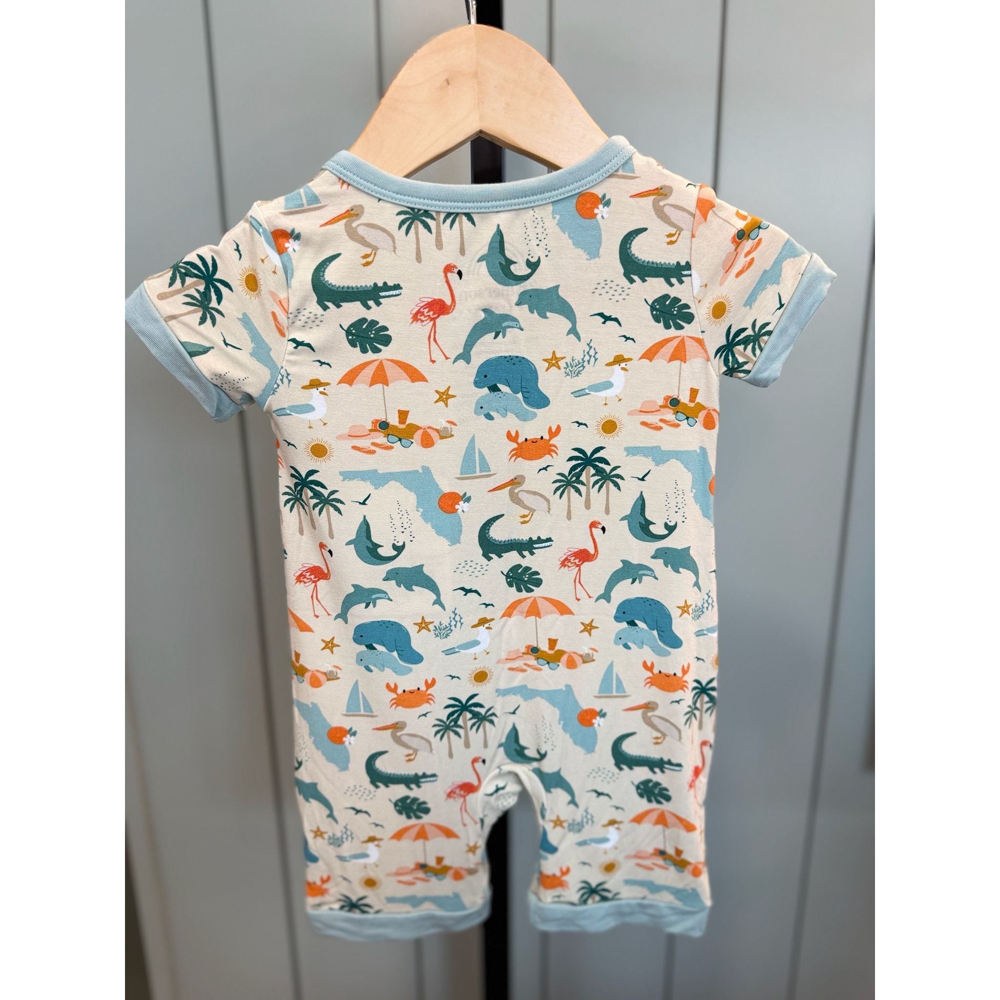 The softest bamboo shortie romper in the Explore Florida state print! Celebrate the state of Florida and all of its iconic imagery, perfect for Floridians and visitors alike. Our shortie rompers start with our signature buttery soft bamboo blend that has the perfect amount of stretch and fabric for a comfortable fit. The bamboo fabric is exceptionally cozy and soft to the touch with the perfect amount of stretch so your little one can wear each size a little longer and move easily. Bamboo is moisture wicking, temperature regulating, and light and breathable, making it perfect for sensitive skin.